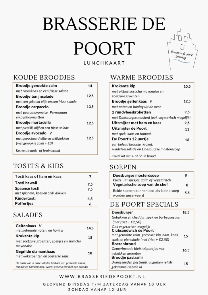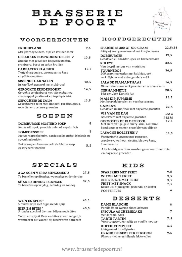 Bij Brasserie de Poort kun je terecht voor heerlijke drankjes, een lunch, diner, shared diner, high wine, high tea of high beer. Voor iedereen is er wat te vinden op onze kaart. Laat jij je graag verrassen door onze koks of wil je gewoon graag meerdere gerechten proeven? Kies dan voor ons verrassingsmenu of ga voor een shared dining 3 of 4 gangen menu! Toch alleen wat drinken? Kom dan genieten van een heerlijke kop koffie, bijzondere biertjes, heerlijke wijnen en ons fijne terras. En vergeet niet wat achter te laten op onze Poort Of Fame!